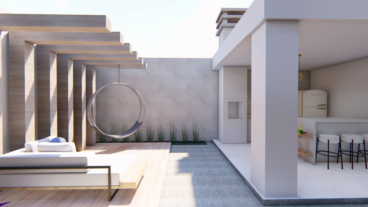 Aos fundos, uma área gourmet super aconchegante, clara e com um pergolado lindo e diferenciado para a área de descanso. Para trazer mais vida à casa, dois pequenos jardins: um canteiro com Orquídeas-bambu e o outro com Trapoeraba-roxa e Yucca.